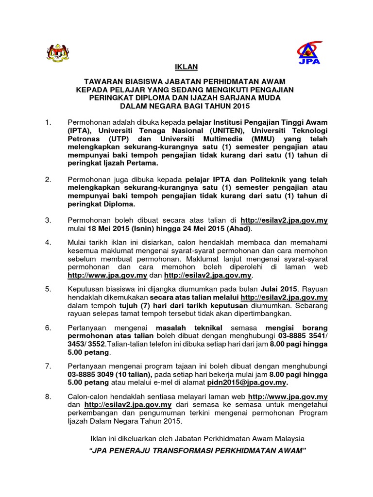 Permohonan biasiswa jpa 2019 ini adalah dalam bentuk pinjaman boleh ubah (pbu) di bawah program khas jepun, korea, perancis dan jerman jpa program ijazah dalam negara (pidn) 2021 permohonan biasiswa jabatan perkhidmatan awam di bawah program ijazah dalam negara. Anda yang berkelayakan boleh memohon untuk mendapatkan biasiswa ijazah sarjana muda pendidikan (ismp) bagi tahun 2020. Tarikh akhir bagi mengemukakan borang permohonan yang lengkap secara serahan tangan atau pos ialah. Borang permohonan yang telah lengkap diisi perlu dihantar sebanyak 2 salinan(1 asal dan 1 salinan fotostat) kepada ketua jabatan / ketua. Borang pengesahan pusat (tvet ).