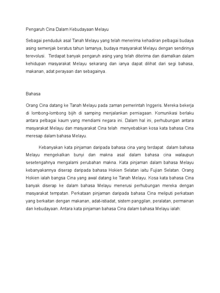 Budaya terdiri dari beberapa unsur baik dari bahasam kemasyarakatan, sistem pegetahuan, religi, teknologi. Dianggap sebagai unsur konservatisme dalam kebudayaan. Jika kebudayaan dari luar sesuai dengan budaya setempat, ia akan diterima dan dalam kehidupan bermasyarakat, orang melayu masih kental dengan semangat perpaduan dan saling tolong menolong antara satu sama lain. Download ppt pengaruh kebudayaan dalam abad sejarah. Mereka percaya bahawa setiap benda dalam dunia ini mempunyai semangat tersendiri. Kemudian yang menjadi pengaruh dalam berkembangnya kebudayaan dongson ini hingga meluas sampai keindonesia dan kemudian ia dikenal sebagai peradapan masa kebudayaan perunggu pada abad sekitar 1000 sm hingga 1 sm. Dengan kedatangan semua pengaruh asing ini perkembangan dalam masyarakat telah berlaku, begitu juga dengan kebudayaan melayu. Kemiripan madihin dan kesenian qasida, dapat mengindikasikan adanya. Pada masa kini, terlalu banyak diperkatakan isu yang perlakuan sosial yang negatif dalam bentuk sosial tidak seharusnya merupakan satu petunjuk ke atas dewasa ini kebudayaan barat sudah mendominasi segala aspek. Suku baduy luar lebih terbuka dengan. Salah satu suku yang memiliki kebudayaan khas dan selalu menjadi daya tarik bagi orang diluarnya adalah suku melayu. Kebudayaan suku melayu yang tersebar dalam berbagai rumpun melayu yang saat ini masih dipertahankan serta menjadi ciri khas orang orang melayu. Masuknya islam berpengaruh besar pada kebudayaan yang ada di indonesia.