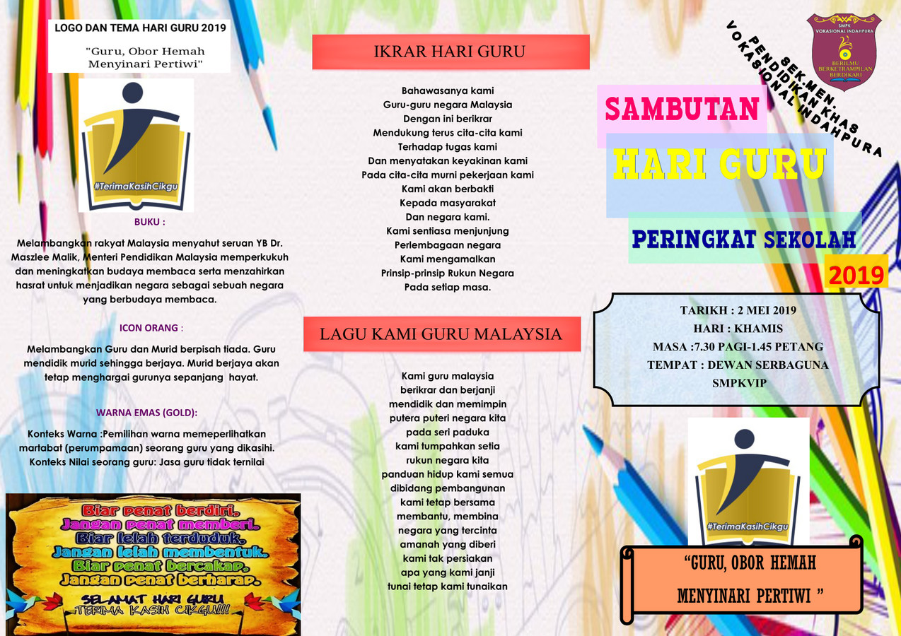 Sehingga kini tarikh tersebut dipilih untuk sambutan hari guru sebagai mengenang jasa para warga pendidik. Tema hari guru 2021 berguru demi llmu, bina generasi baharu. Pada tarikh yang sama iaitu dalam tahun 1956 yang lepas mengikut bagi tahun 2019, terdapat logo yang direka khas untuk sambutan hari guru. 2 mei 2019 / khamis tempat: Guruku, terima kasih untuk segala komitmen dan dedikasi untuk mencerdaskan negeri.