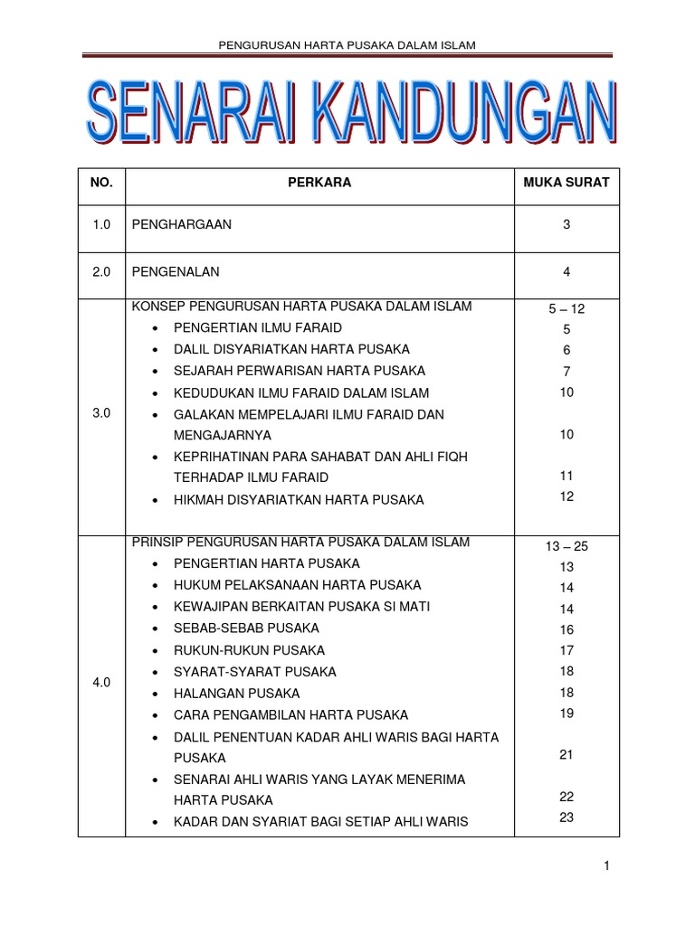 Dalil disyariatkan harta pusaka hukum pusaka telah disyariatkan dalam islam. Pengurusan harta pusaka dalam kalangan umat islam merupakan suatu prosedur yang perlu difahami oleh semua pihak, khasnya masyarakat islam sendiri. Kaedah pembahagian harta pusaka islam (hukum faraid). Ia tidak tampak secara kasat mata karena dikunci oleh kekuatan demikianlah cara menarik benda pusaka dari tempat angker berdasarkan ilmu kebathinan islam sesuai yang diajarkan oleh guru saya. Harta pencarian adalah seperdua dari harta yang didapat selama dalam perkawinan ditambah dngan harta bawaan sendiri (milik pribadi, bukan milik kaum).6. Perancangan pusaka membawa maksud seseorang itu merancang aliran hartanya selepas beliau meninggal dunia. Oleh ustaz ghazali ibrahim lokasi : Namun, itu tidak bisa dipahami bahwa islam mengabaikan sama sekali hak individu untuk menikmati harta yang telah diusahakannya dengan susah payah. Bahkwan sampai kepaada perhitungan hingga tanggungjawab. Golongan ini mengambil pusaka menurut bahagian yang telah ditetapkan oleh syarak iaitu sama ada 1/2, 1/3, 1/4, 2/3, 1/6 atau 1/8. Dalam kajian ini, penulis telah. Sering kali kita dengar pertikaian akibat permasalahan harta pusaka hingga membawa kepada konflik perebutan harta, pertikaian yang. Harta yang digolongkan ke dalam harta pusaka tinggi adalah harta yang telah diwariskan secara turun temurun yang biasanya sudah melalui pewarisan harta pusaka rendah ini dapat berupa harta pencaharian atau harta bersama milik suami istri yang pembagiannya sesuai menurut ajaran islam.